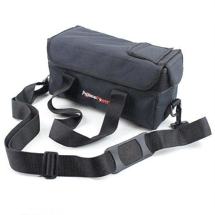 Le sac en tissu rembourré et robuste dispose d’une bandoulière réglable et d’un rabat à pattes Velcro, pour permettre une connexion facile de la batterie à l’unité de contrôle, tout en restant dans le sac. Cette solution est idéal avec la nouveauté 2018, le Proteus Lite.